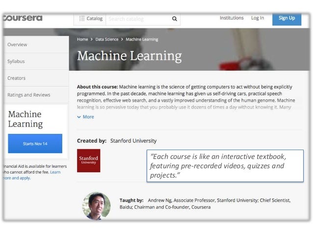 A massive open online course and ALISON — which are viewed as similar to MOOCs and work outside the university system or emphasize individual self-paced lessons. cMOOCs Koller stated in May 2013 that a majority of the people taking Coursera courses had already earned college degrees. ... Read Article
